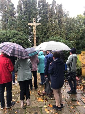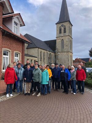 Wie im Mai begonnen, sollte nur Teil 2 des Weges mit dem Fahrrad gefahren werden, aber das Wetter spielte diesmal nicht mit. Einen Dauerregen-Tag hatten sich die ca. 25 Teilnehmer zwar nicht gewünscht, machten sich als "Pilger der Hoffnung" dann aber in Fahrgemeinschaften auf den Weg. Die Dorfkirche Thuine und Friedhof am Kloster Thuine mit Grab von Mutter Anselma waren nach Beginn in der Vitus Kirche erste Stationen. Danach Fahrt zum neuen Messingen Antoniuseck und in die dortige Kirche. In Beesten wartete eine Führung in der Kirche mit Herrn Wessling und eine Führung im Töddenhaus mit Herrn Schlei. "Sowas sieht man sonst nie, obwohl mal draußen oft vorbeifährt".... waren sich die zusammenstehenden Gruppen einig. Bewirtet und umsorgt wurden wir ganztägig von "Freunden" und hatten das Glück ganztägig begleitet zu werden durch viele anregende Impulse. So viel Liebe zum Detail durften wir vom vorbereiteten Team erleben.