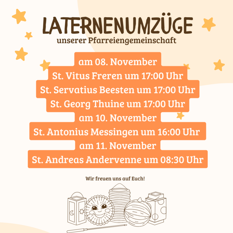 Um den 11. November herum feiern unsere Kitas und Grundschulen das Fest des Hlg. Martin. Hier finden Sie eine Auflistung der Umzüge. Im Gottesdienstplan sehen sie die weiteren Feierlichkeiten zu dem Gedenktag des Soldaten und dem ehem. Bischofs.